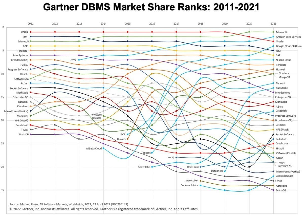A change of guard at the top. Oracle has dominated the market for a long time and is being challenged and/or surpassed by Microsoft, Amazon Web Services, and Google Cloud Platform. The cloud providers are leading the way with compelling cloud database offerings.