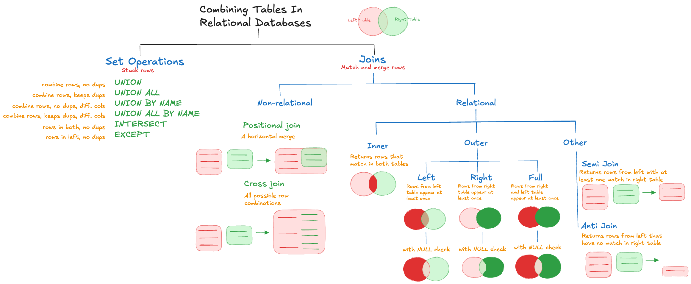The two tables in a join are called the left and right sides of the relation. Joins are categorized as outer or inner joins depending on whether rows with matches are returned. An inner join returns only rows that match in the left and right tables of the join. In DuckDB, it is the default join type if you do not qualify the specific join type. Outer joins return rows that do not have any matches; they are further classified as (see Figure 15.5)