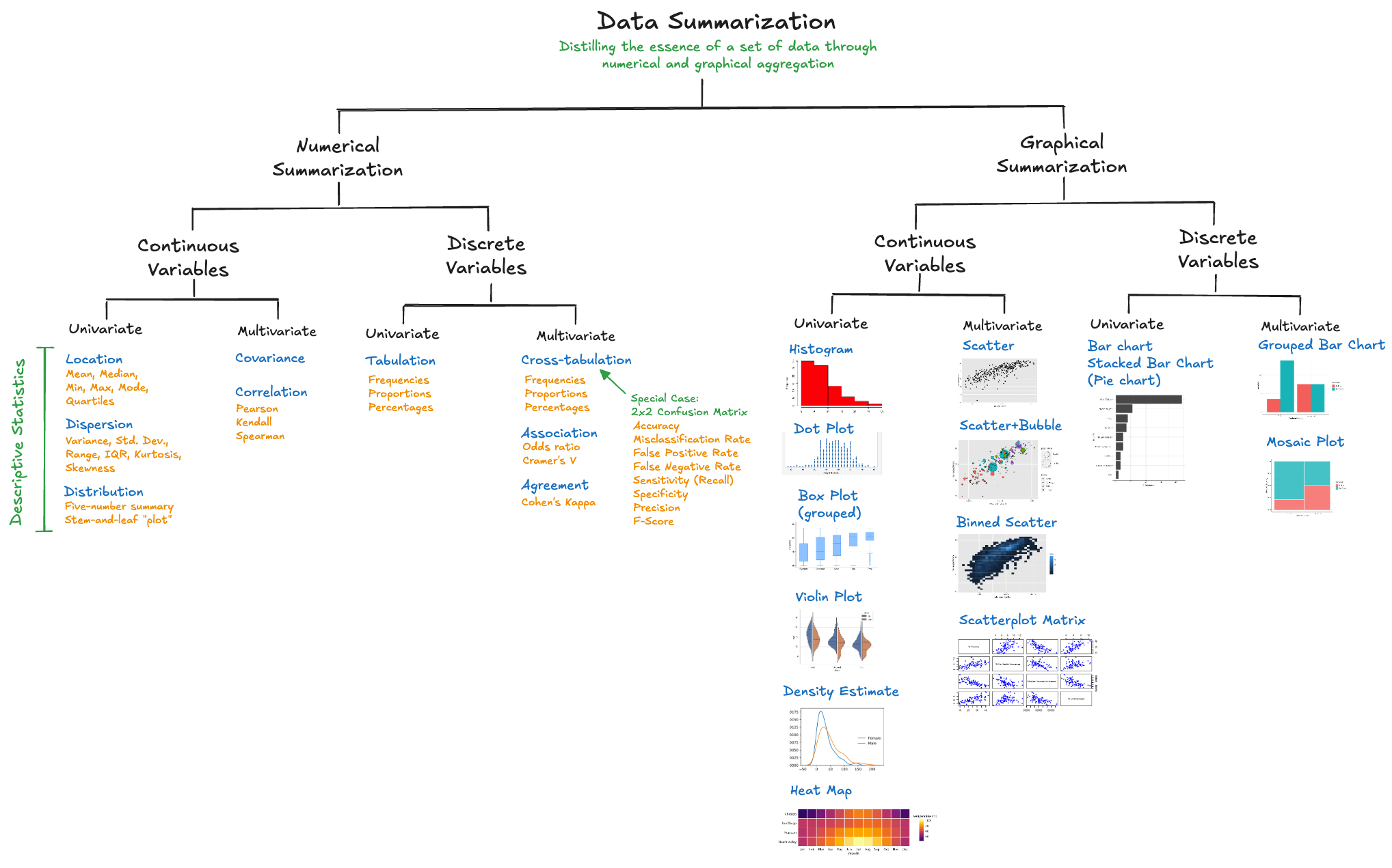 Data summarization is the numerical, tabular, and graphical distillation of the essence of a data set and the relationships between its variables through aggregation.